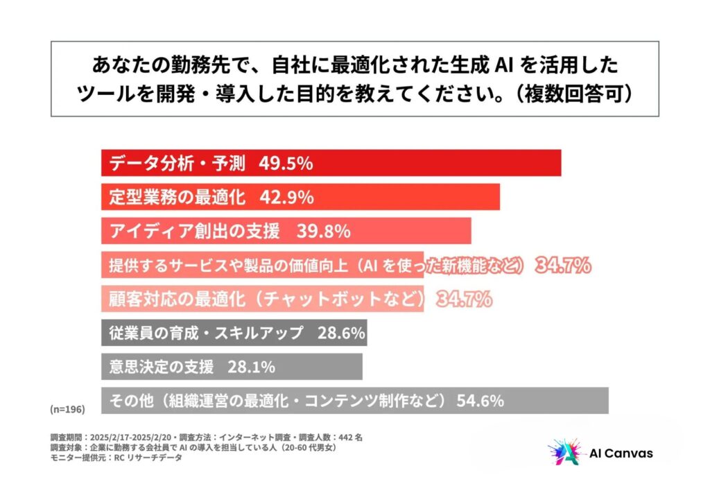 近年、生成AIの技術は飛躍的に進化し、企業の業務効率化を支える手段として注目されています。議事録作成、チャットボット、コンテンツ制作などの幅広い分野で活用が進んでいます。また、汎用的な生成AIツールが多くリリースされる中、人手不足の解消や競争力を高めることを目的に自社に最適化された生成AIを活用したツールの開発・導入を検討する企業も増加しています。しかし、生成AIの精度は完璧ではなく、「導入後に期待した効果が得られず、逆に業務効率が低下してしまう」ケースも少なくありません。さらに、自社独自の業務に適したAIを開発・導入するには、コストや技術面でのハードルも存在します。そこで今回、「AI Canvas」は企業でAIの導入を担当する方を対象に、「自社に最適化された生成AIを活用したツール開発の実態」に関する調査を実施しました。