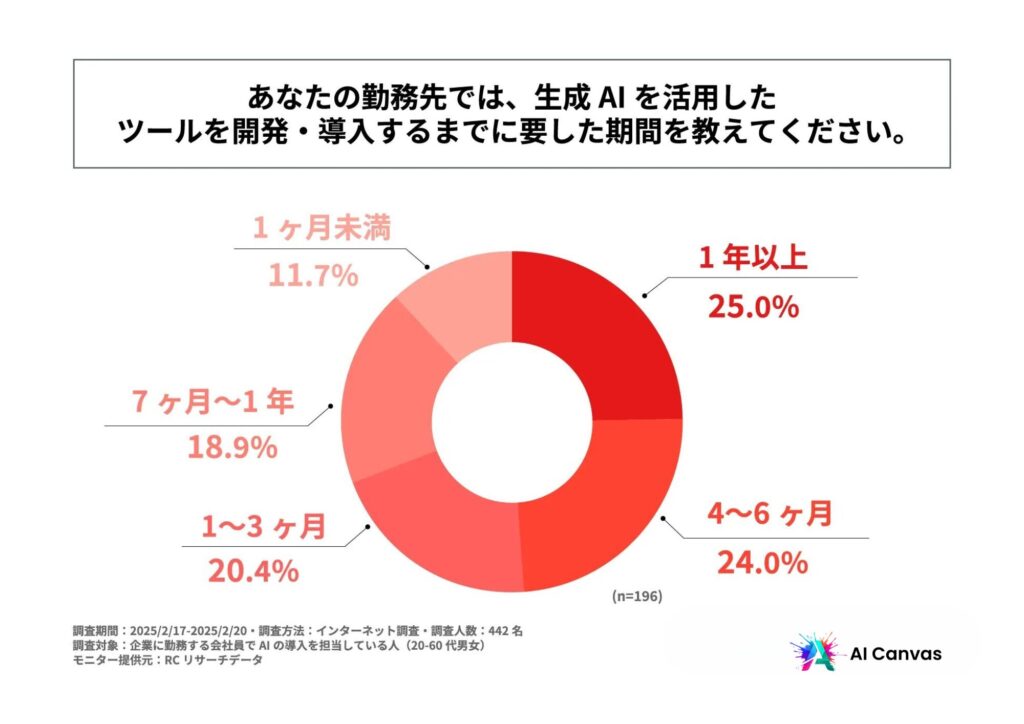 ・生成AIを活用したツールを開発・導入するまでに要した期間、最も多い回答は「1年以上」