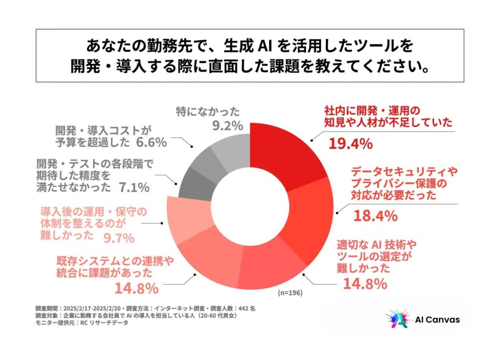 生成AIを活用したツールを開発・導入する際、主に「社内の知見や人材不足」と「データセキュリティやプライバシー保護の対応」という課題に直面した企業が多い