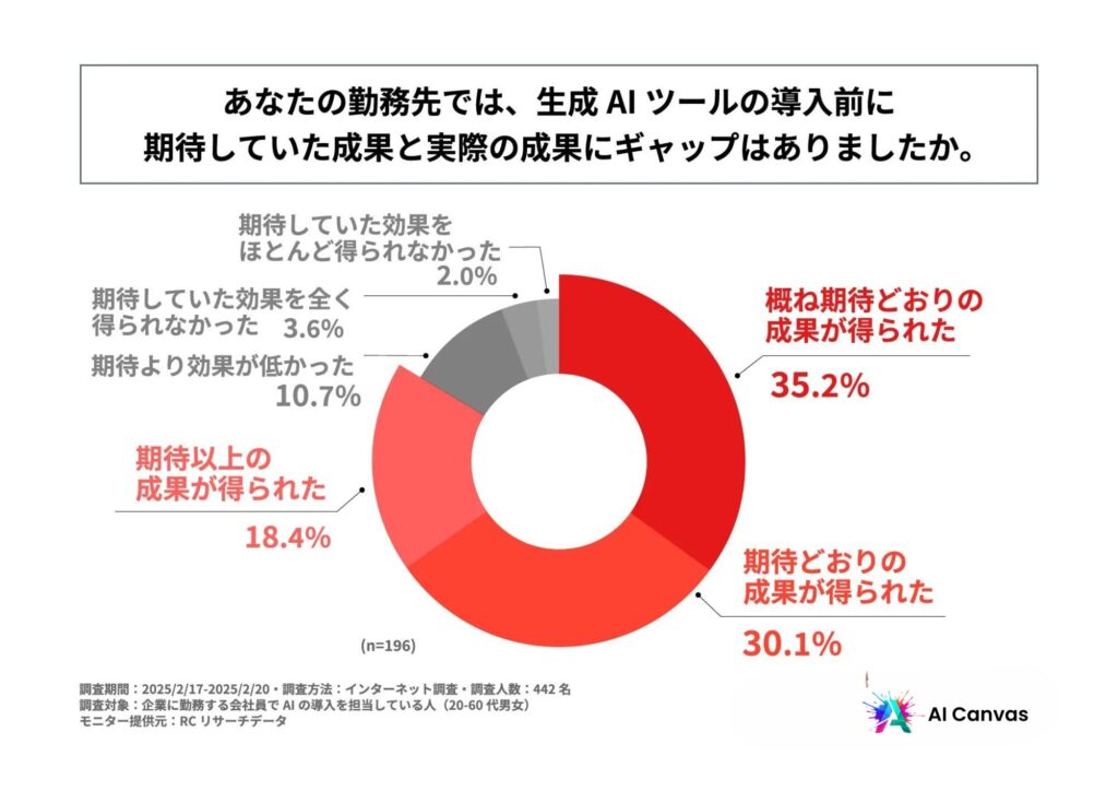 続いて、自社に最適化された生成AIをすでに導入していると回答された方に、「勤務先で、生成AIツールの導入前に期待していた成果と実際の成果にギャップはあったか」を尋ねる設問の回答では、1位が「概ね期待どおりの成果が得られた」で35.2%、2位が「期待どおりの成果が得られた」で30.1%、3位が「期待以上の成果が得られた」で18.4%という結果になりました。これらの回答を合計すると、回答率80%を超える形となり、この結果から、8割以上の企業が、自社に最適化された生成AIの導入により、導入前の期待に沿う成果が得られていることが明らかになりました。