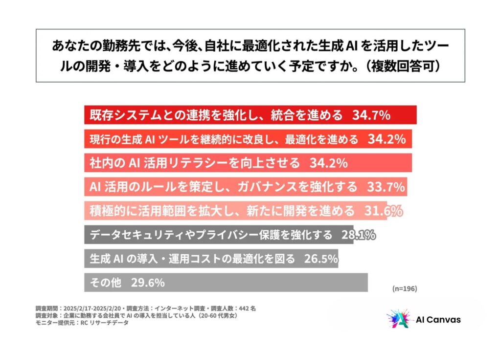 調査の最後、自社に最適化された生成AIをすでに導入していると回答された方に「勤務先では、今後、自社に最適化された生成AIを活用したツールの開発・導入をどのように進めていく予定か」を尋ねる設問への回答で多かったのは、1位が「既存システムとの連携を強化し、統合を進める」で34.7%、2位が同率で「現行の生成AIツールを継続的に改良し、最適化を進める」と「社内のAI活用リテラシーを向上させる」で34.2%という結果になりました。ここで、AIをさらに業務に活用するため、システム面および人的な面での最適化を図る、といった意図の回答が上位に並ぶ結果となりました。