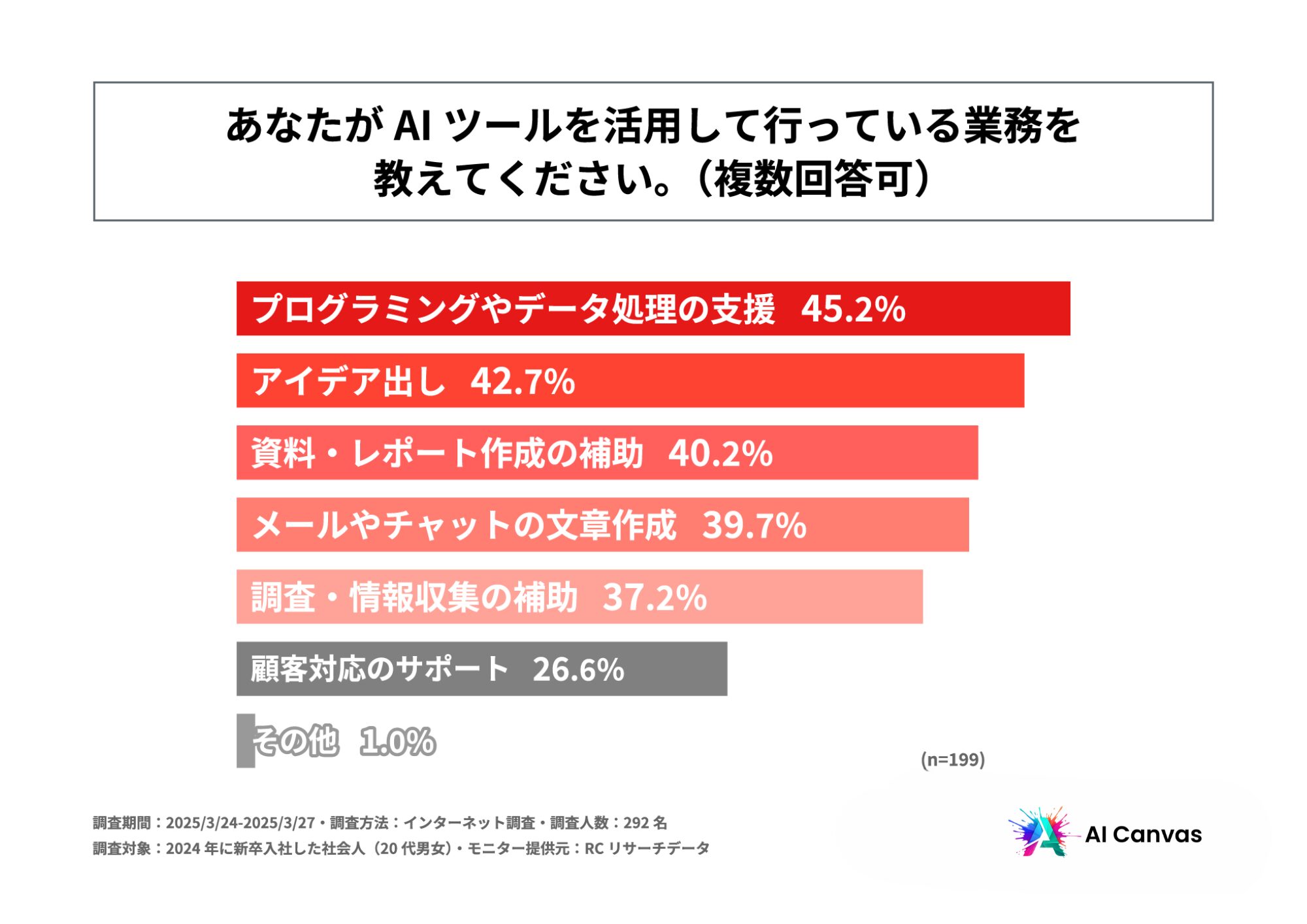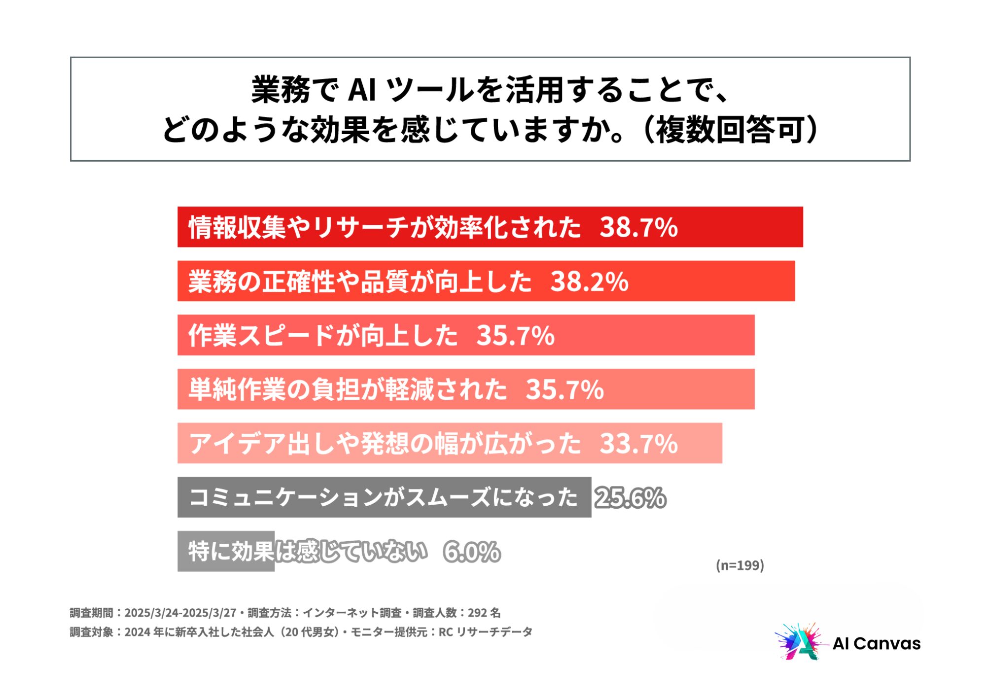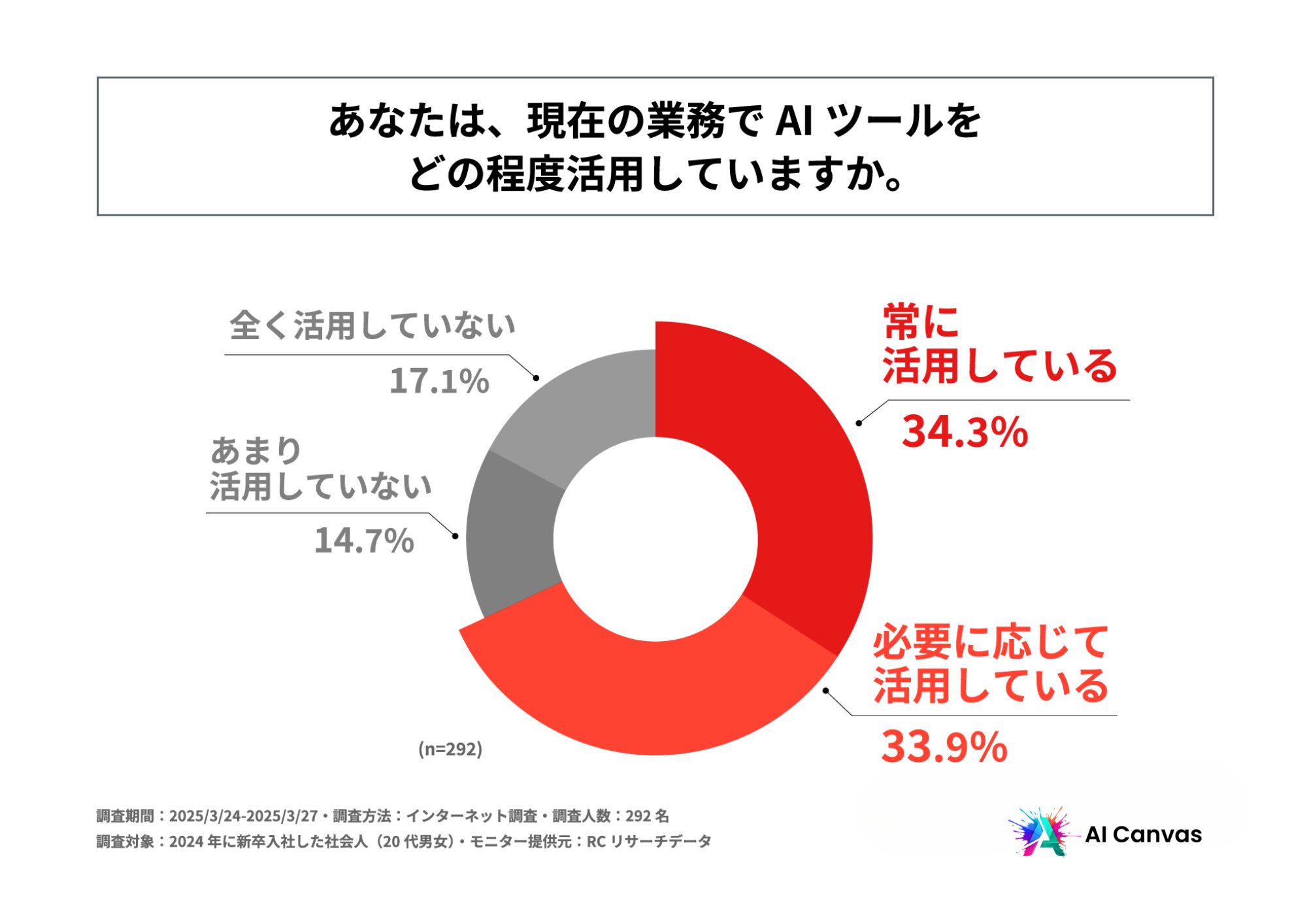 AI技術の進化により、企業では業務効率化や生産性向上を目的としたAIの導入が進んでいます。特に、ChatGPTなどの生成AIは、資料作成や情報収集、社内コミュニケーションの補助など、日常業務に組み込まれつつあります。一方で、AIの活用度には個人差があり、世代によるリテラシーの違いも指摘されています。2024年に新卒入社した社会人(Z世代後半)は、学生時代からAIツールに触れる機会が多かったデジタルネイティブ世代です。入社から1年経った今、彼らは企業での業務にどのようにAIを活用しているのでしょうか。また、企業側の環境は、そうした若手の期待やスキルに対応できているのでしょうか。そこで今回、「AI Canvas」は、2024年に新卒入社した社会人を対象に「若手社会人のAI活用実態」に関する調査を実施しました。