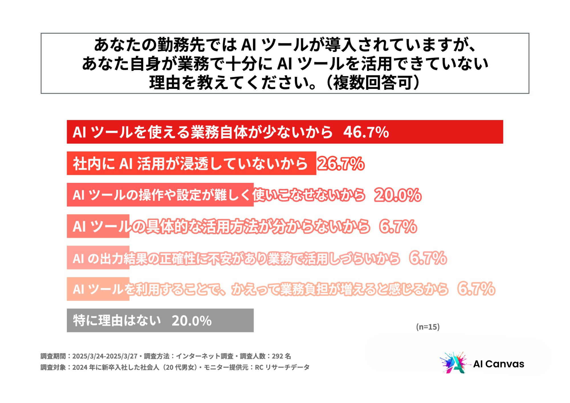調査の最後、会社で公式にAIが導入されているものの、現在の業務にAIツールを活用していないと回答された方に「勤務先で、AIツールが導入されているものの、自身が業務で十分にAIツールを活用できていない理由」を尋ねる設問への回答で多かったのは、1位が「AIツールを使える業務自体が少ないから」で46.7%、2位が「社内にAI活用が浸透していないから」で26.7%、3位が「AIツールの操作や設定が難しく使いこなせないから」と「特に理由はない」で20.0%という結果になりました。この結果から、AIツールを使える業務自体が少ない、という理由は仕方がないとしても、周囲が使っていないから使っていない人や、AIツールは操作や設定が難しく使いこなせていないという人が一定数いることが明らかになりました。